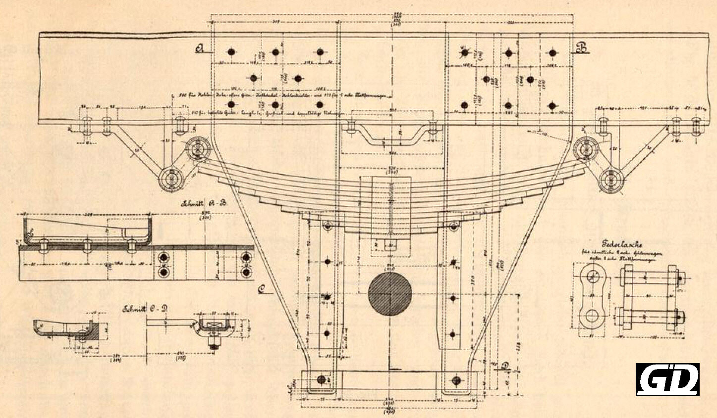 Einzelachs-Laufwerk Blattfedergehänge (Parabelfedern) mit Doppelschaken und erhöhter Reibungsdämpfung durch zusätzliches Federblatt und Reibungsklammern Quelle: Archiv FVG/ ZEV + DET Gls. Ann. 123 (1999), 7/8, S. 296 |