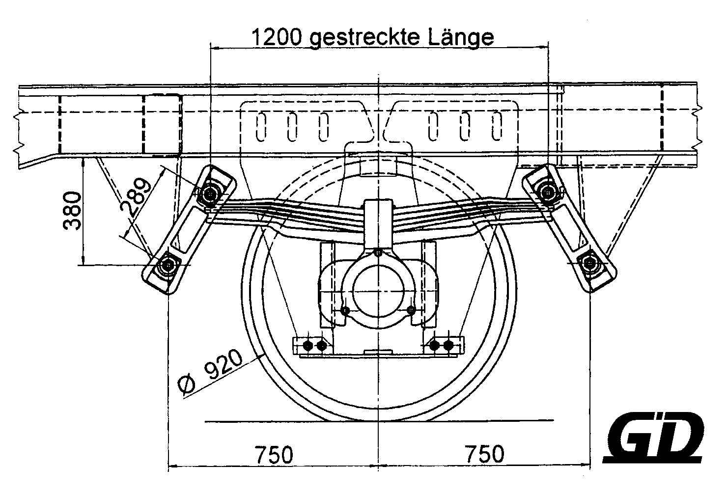 Einzelachs-Laufwerk Blattfedergehänge (Parabelfedern) mit Doppelschaken nach UIC 517 Quelle: Archiv FVG/ETR 48 (1999), Heft 6, S. 368 |